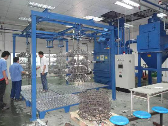 吊鉤式拋丸機的工作順序:除塵系統運行—開提升機—開螺旋輸送器—開分離器—吊鉤在清理室外裝載工件并升至一定高度—吊鉤進入清理室內,到指定位置后停止—清理室大門關閉,吊鉤開始旋轉—拋丸器和供丸閘開,拋丸清理工作開始—吊鉤所掛工件清理完畢,供丸閘門關—拋丸器停—吊鉤自轉停—清理室大門開,吊鉤移出清理室—吊鉤在清理室外卸工件—整機工作停止。