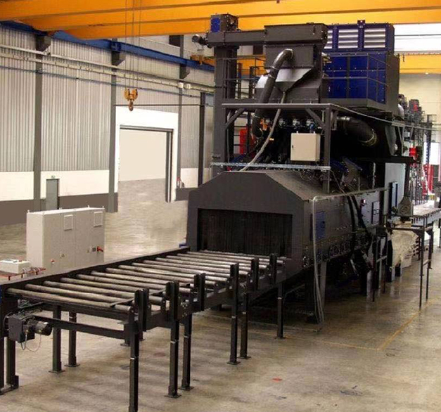 落入鋼材上面的彈丸與銹塵經吹掃裝置吹掃,撒落下來的丸塵混合物由回收螺旋輸送到室體漏斗、縱橫向螺旋輸送機匯集于提升機下部再提升到機器上部的分離器里,分離后的純凈彈丸落入分離器料斗中內,供拋丸循環(huán)使用。通過式拋丸機拋丸清理中產生塵埃,由抽風管送向除塵系統(tǒng),凈化處理后的凈氣排放到大氣中,顆粒狀塵埃被捕捉收集通過式拋丸機主要用于建筑、橋梁等行業(yè)用大型工字型鋼、等較高的鋼結構件消除應力及表面除銹清理。