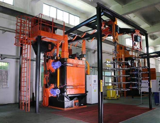 雙吊鉤式拋丸機由兩個吊鉤裝載工件交替進入拋丸清理室內。利用拋丸器將0.2~0.8的彈丸拋向工件的表面,使得工件的表面達到一定的粗糙度,讓工件變得美觀,或者改變工件的壓應力提高壽命。本機型廣泛應用于鑄造、建筑、化工、電機、機床等行業的中、小型鑄、鍛件的表面清理或強化處理。