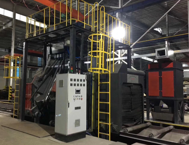 鋼板通過式拋丸機主要有輸送輥道、前后密封室、拋丸室、拋丸器總成、彈丸循環系統、彈丸清掃系統、除塵系統以及電控系統等組成。