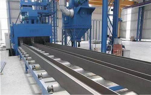 型鋼拋丸機用于大型工字型鋼、H型鋼尺寸較高的鋼結構件消除應力及表面除銹清理。輥道通過式拋丸機,清理過程中由電氣控制的可調速輸送輥道將鋼結構件或鋼材送進清理機室體內拋射區,其周身各面受到來自不同坐標方位的強力密集彈丸打 擊與磨擦,使之其上的氧化皮、銹層及其污物迅速脫落,鋼材表面就獲得一定粗糙度的光潔表面,在清理室外兩邊進出口輥道裝卸工件。