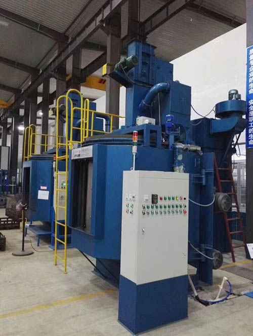 至于小一些的曲軸,如φ152~203mm、長914mm,通常是利用吊鉤式拋丸機拋丸清理。曲軸懸掛在吊鉤上,然后經懸鏈的轉動送入安裝有多個拋頭的拋丸室體內,進行拋丸清理。吊鉤在拋丸室里360°旋轉,曲軸表面在高速丸流下被清理。其清理速度能夠到達250件/h,且清理效果非常好。
